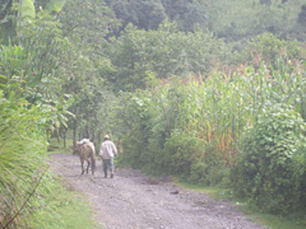 The bus arrived at the end of its route after the hour ride and we walked the rest of the way, about an hour up to the village. We saw only a handful of people in the early dawn: a few children running along the road heading to school or running away from these strange gringos, several men walking to work with various field tools and even a mule strolled down the muddy road fully loaded without an owner in sight. We enjoyed the trek up through the hills, way above the village of Salquil. I especially enjoyed the quiet stillness of the wet, lush green terrain.
