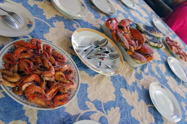 Delicious seafood lunch. Photo credit: Yungkit Flordeliza had prepared her best seafood (shrimp, crabs, fish and oysters) for us to try before our day out on the open water. The food was delicious. So delicious that I seemed to gain a considerable number of pounds during the meal and broke the chair I was sitting on, fell backwards into the rocky garden and cut my leg.